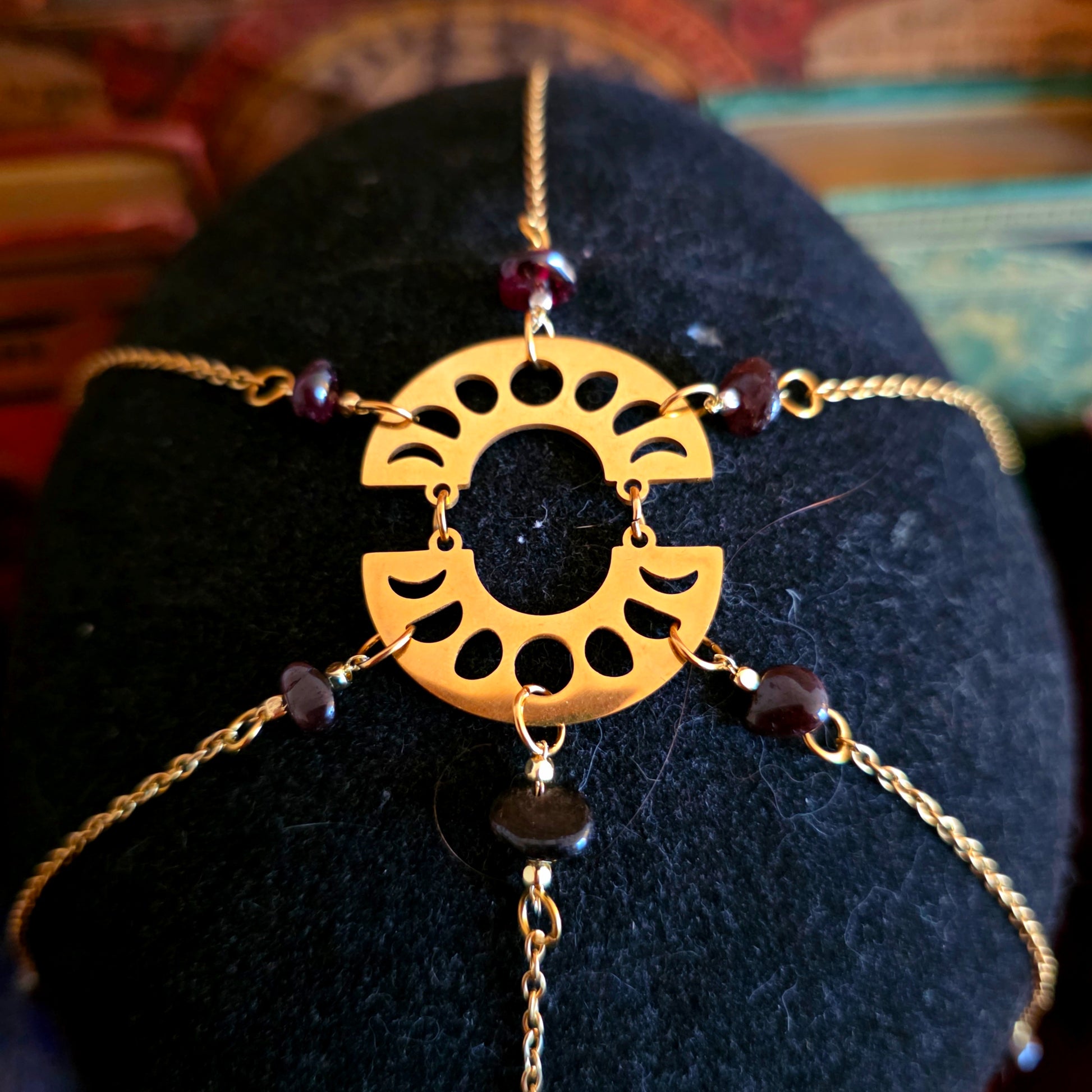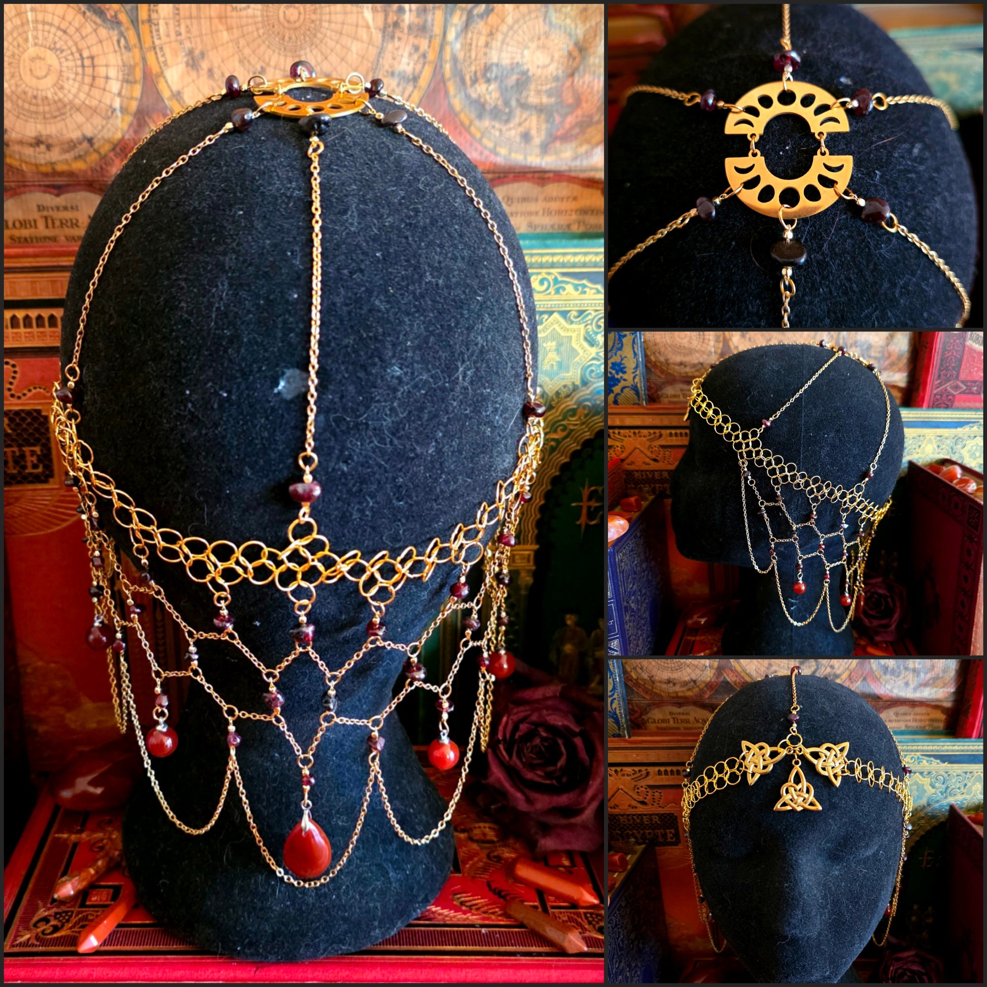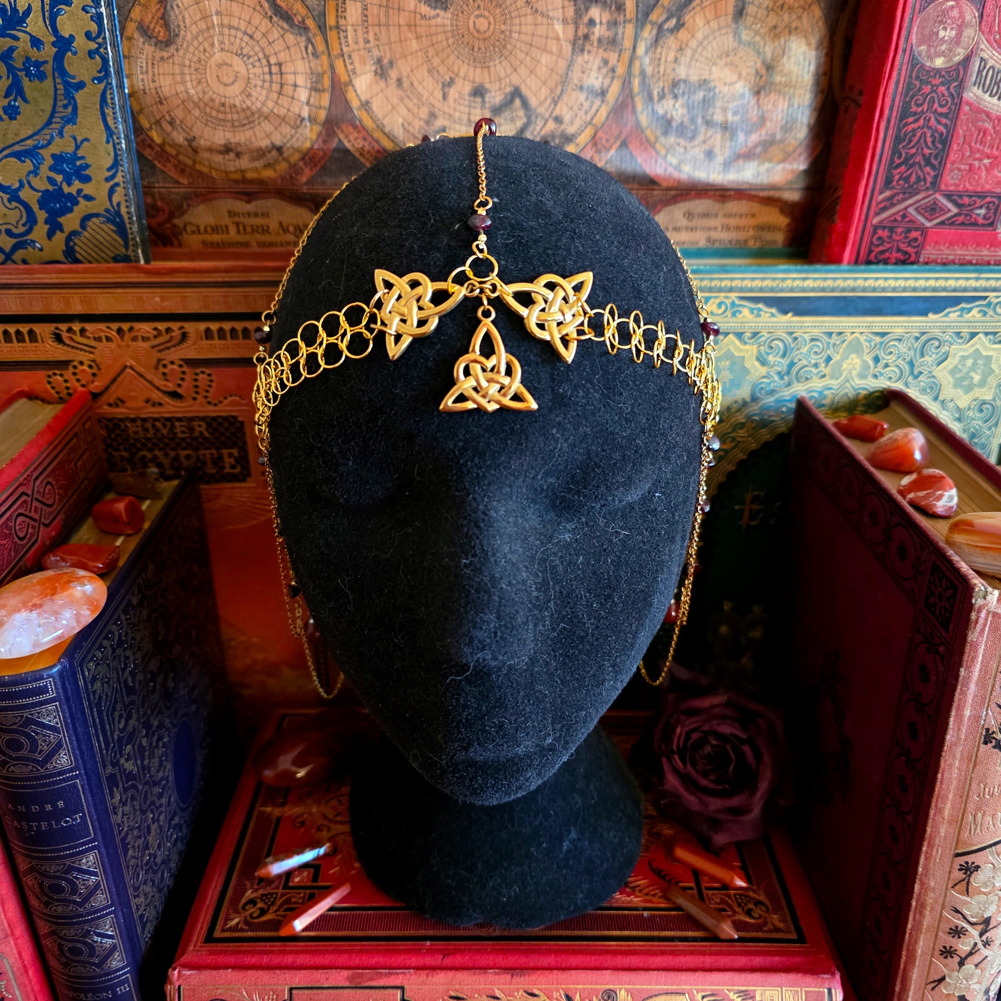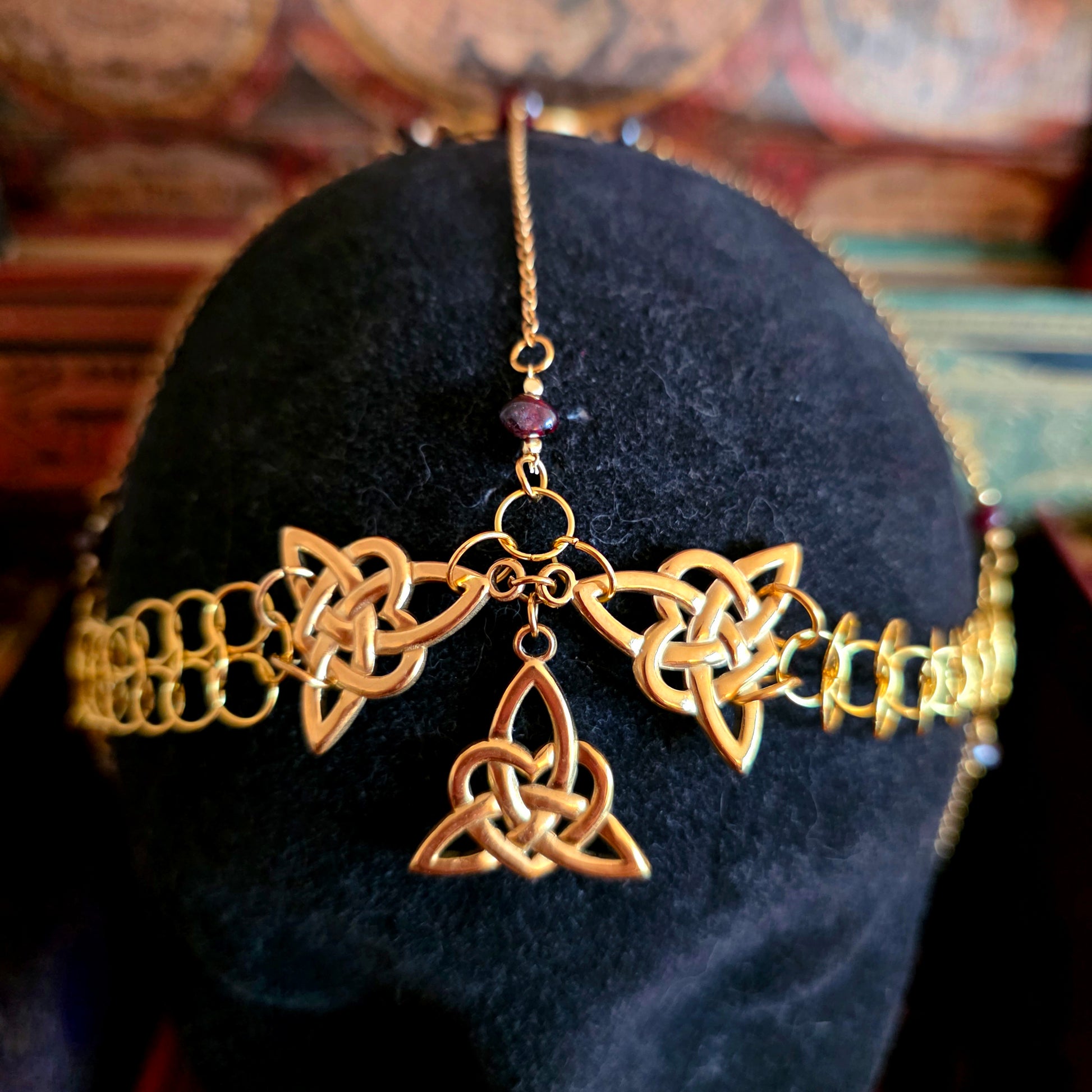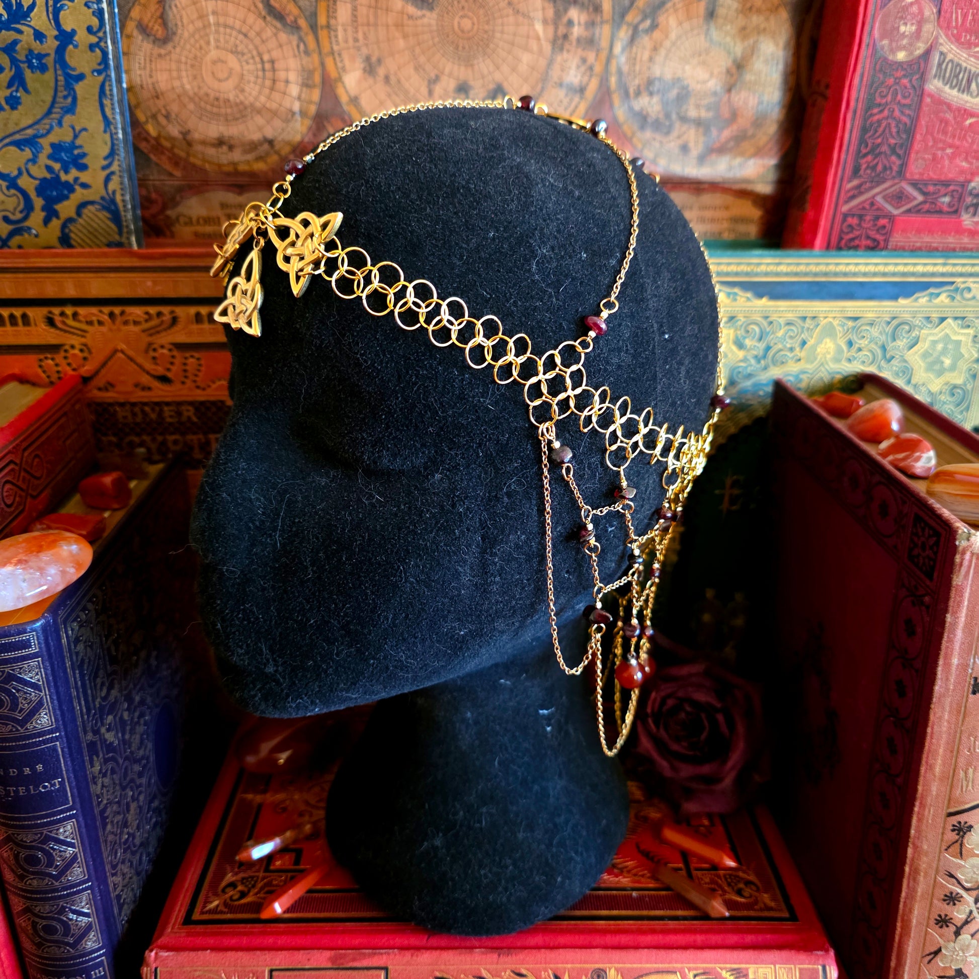 Aliénor - Tiare univers médiéval fantasy dorée acier inoxydable métal cotte de maille noeud celtique - pierres de grenat et cornaline - Les Rouages du Temps