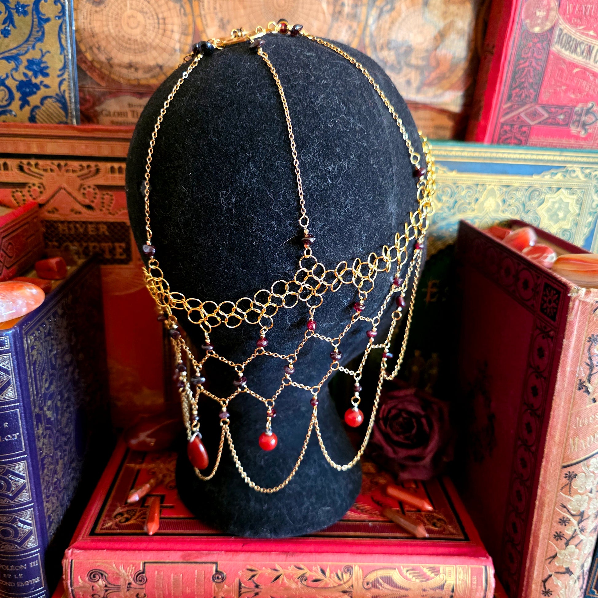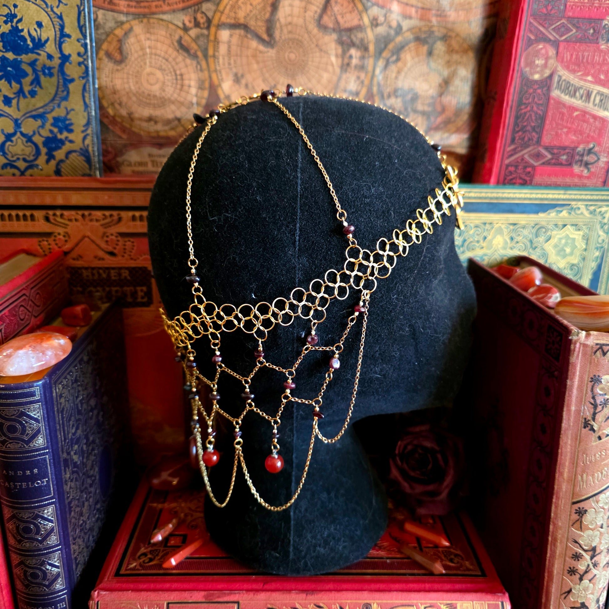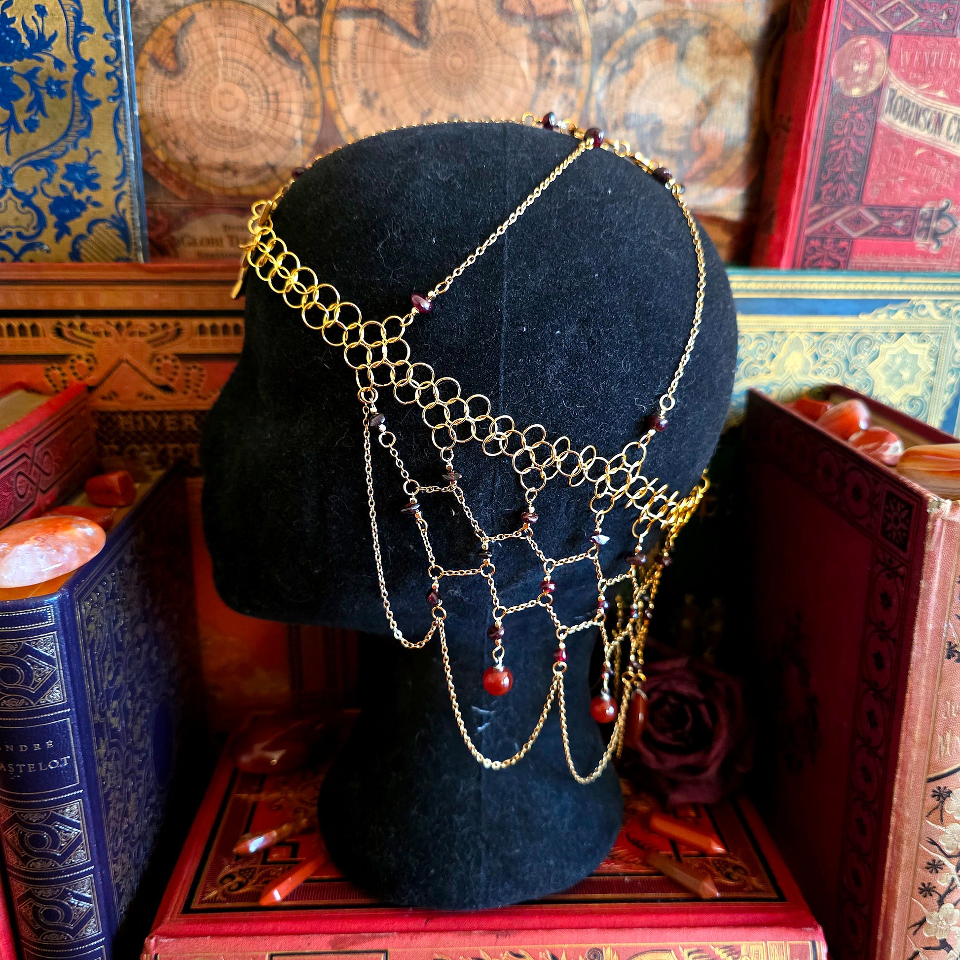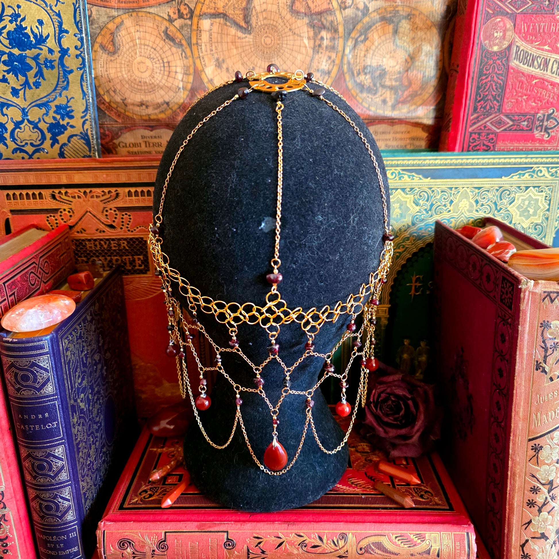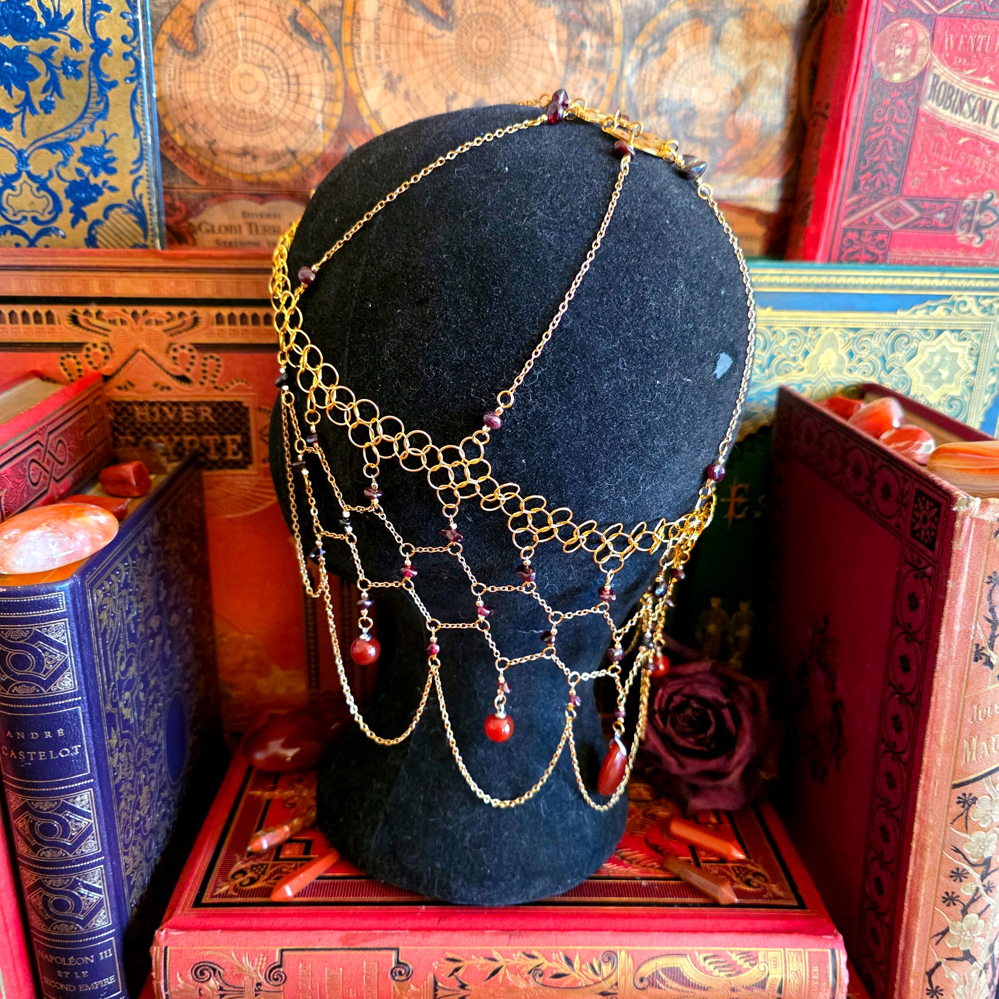 Une superbe tiare inspirée de l'univers médiéval-fantasy réalisée à partir de cotte de maille assemblées main en métal, de chaînes et breloques en acier inoxydables ainsi que de pierres de grenat (perles) et de cornaline (boules et gouttes).