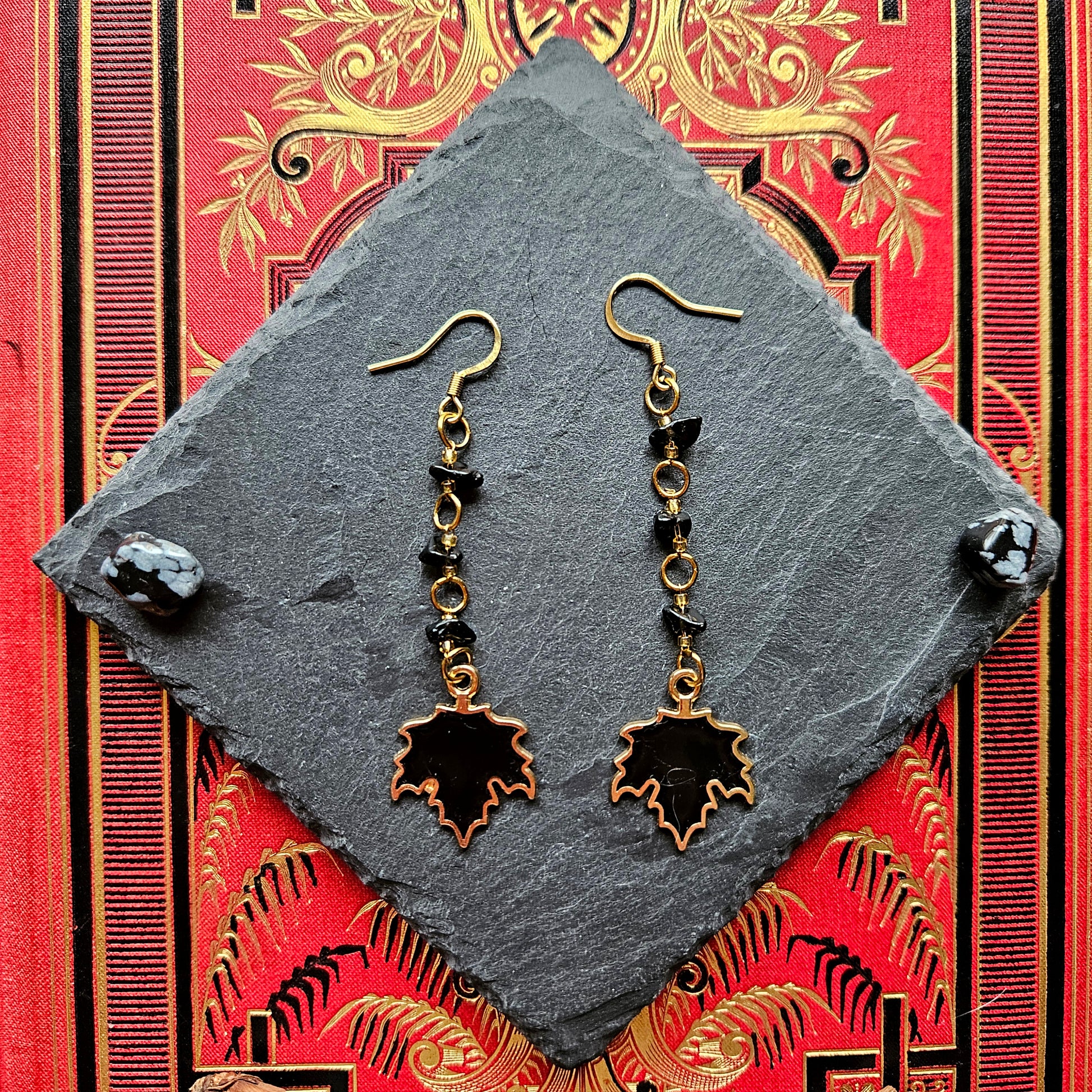 Carpo - Boucles d'oreilles "Automne" feuilles d'érables noires et perles d'obsidienne - Les Rouages du Temps
