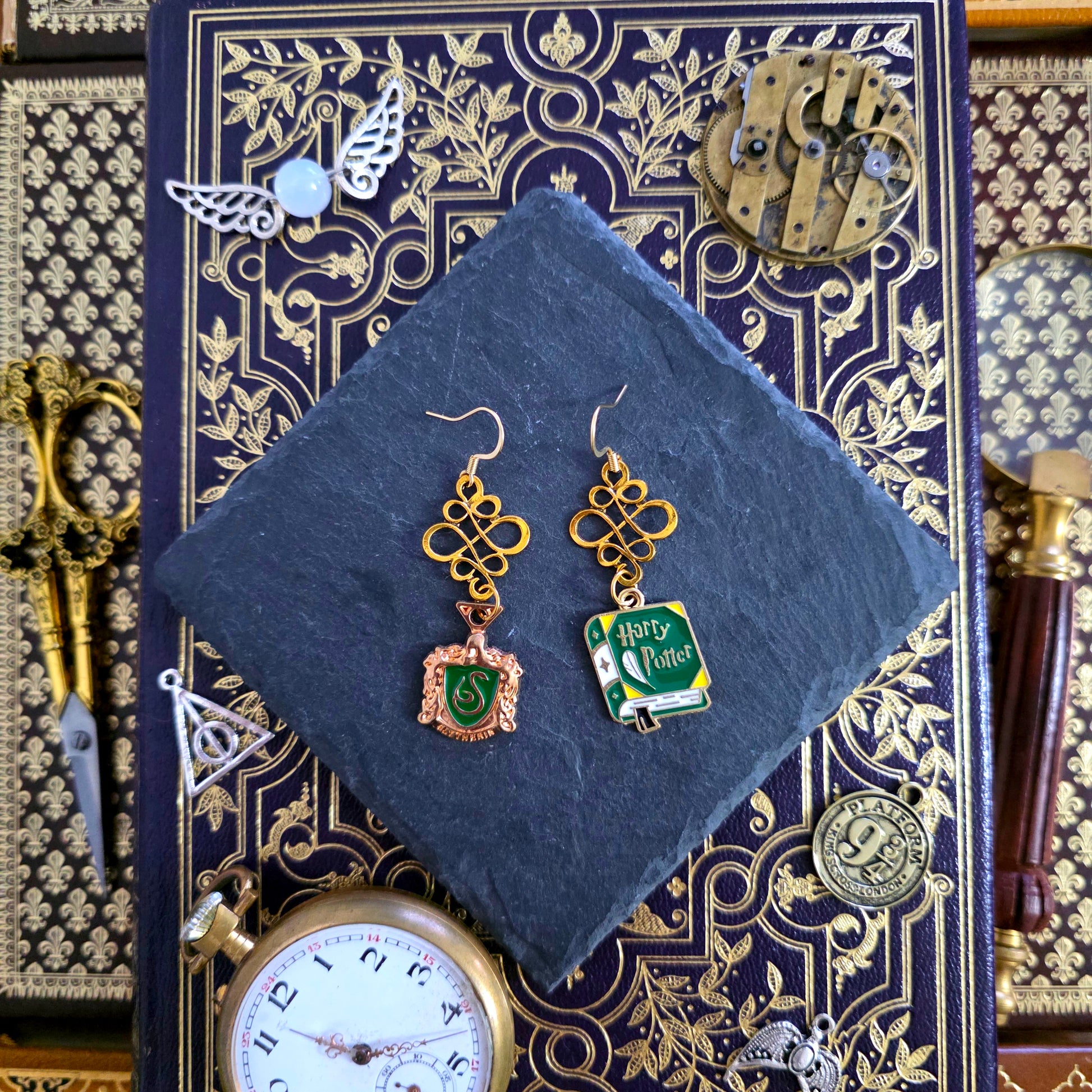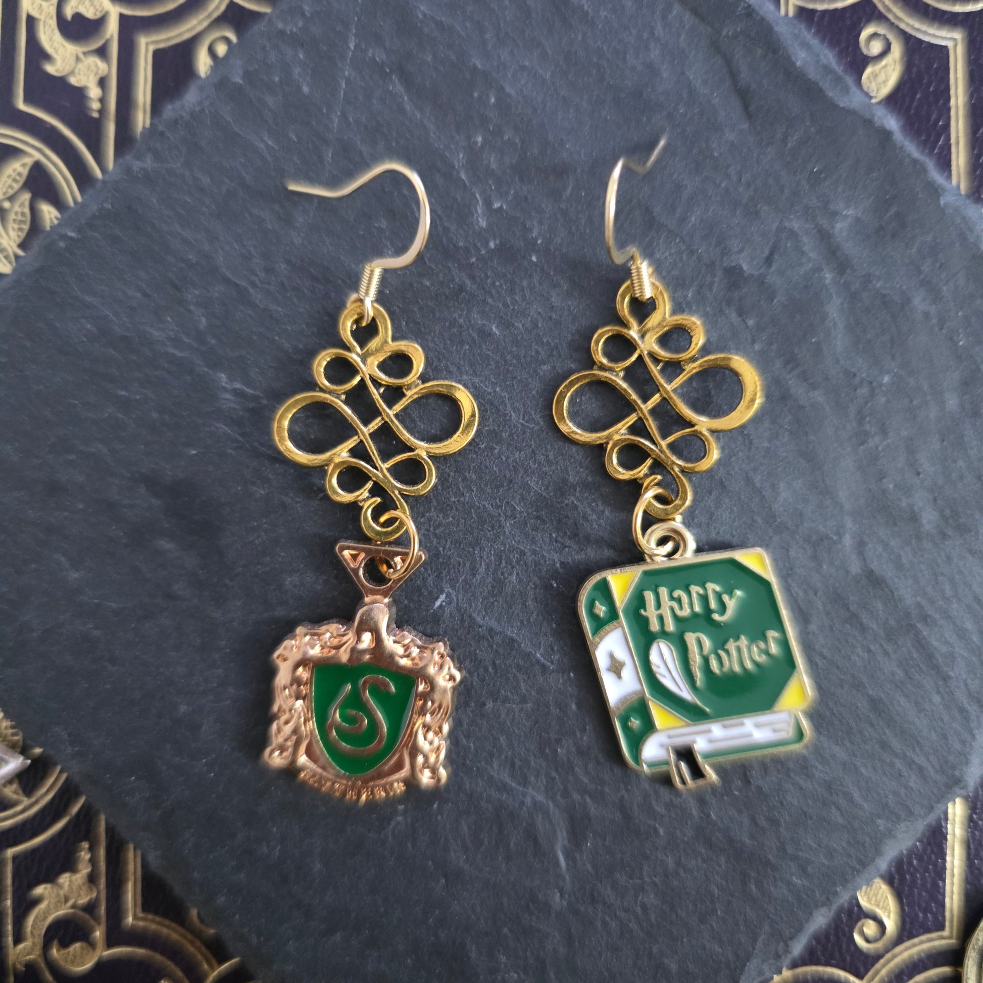 Une jolie paire de boucles d'oreilles dorées inspirée de la saga Harry Potter avec des breloques aux couleurs de la maison Serpentard.