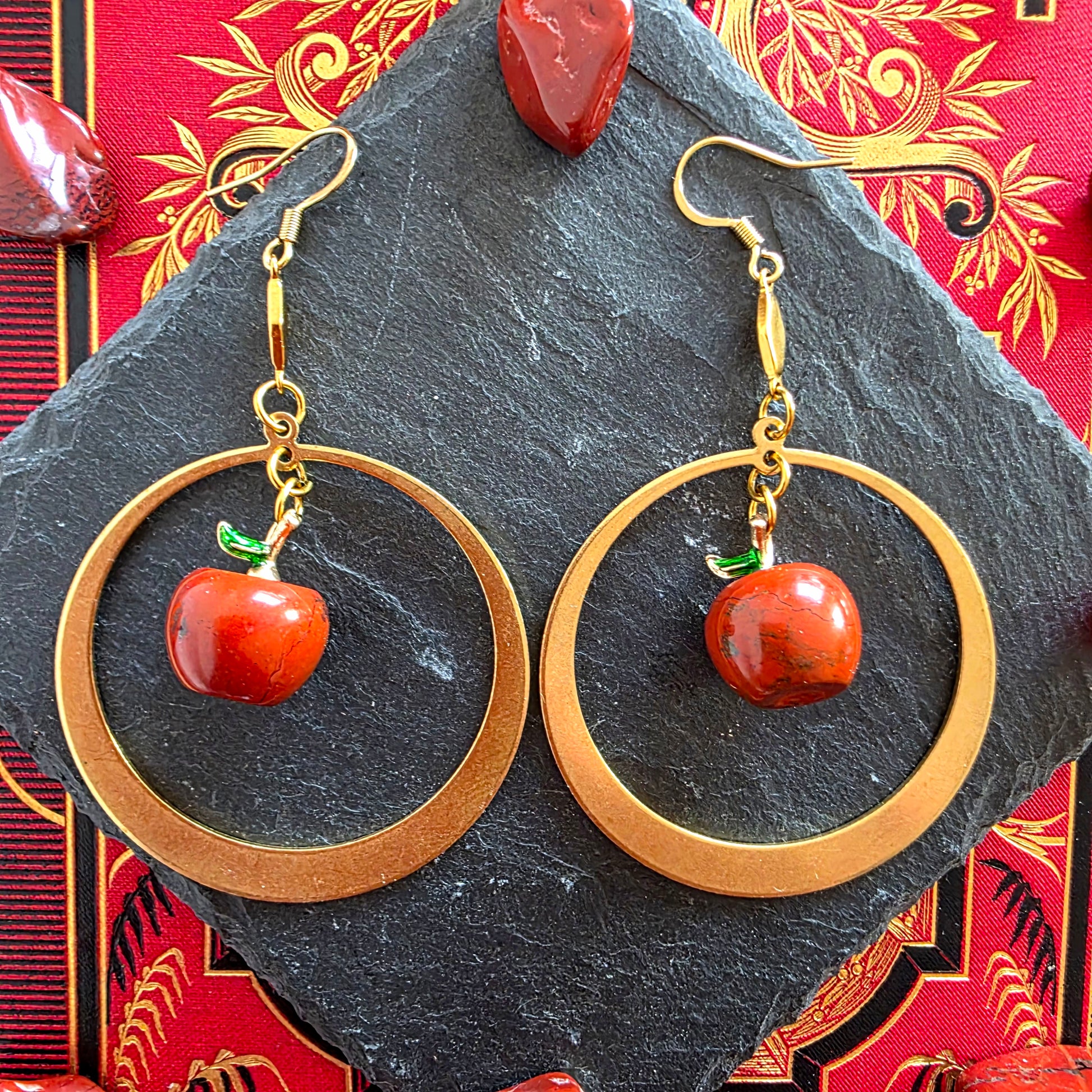 Idunn - Boucles d'oreilles créoles anneaux laiton doré et pommes jaspe rouge - Les Rouages du Temps
