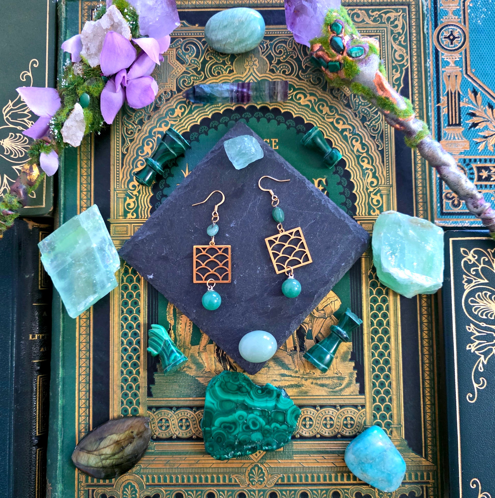 Une superbe paire de boucles d'oreilles inspirées des styles Art Déco et Art Nouveau, réalisées à partir de breloques en acier inoxydable doré et de perles en pierres d'aventurine.
