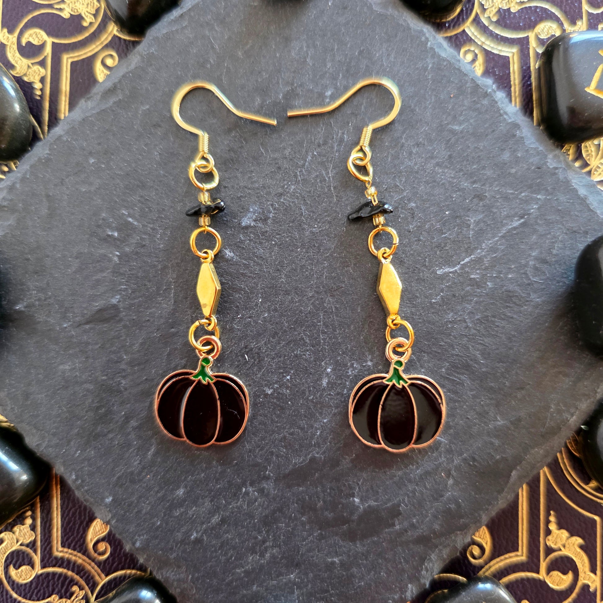 Samhain - Boucles d'oreilles "Automne" acier inoxydable citrouilles et perles obsidienne - Les Rouages du Temps
