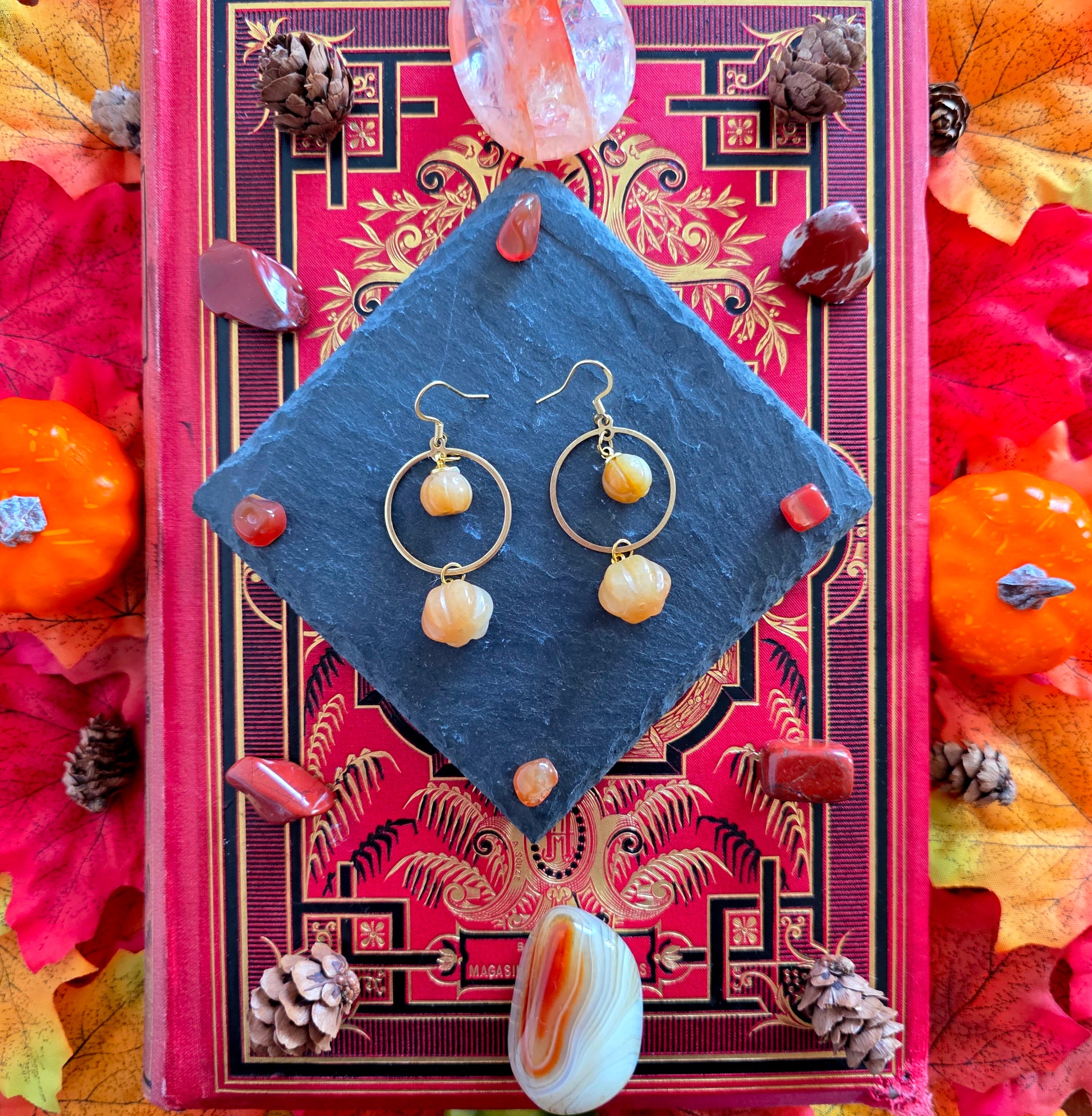 Une ravissante paire de boucles d'oreilles inspirées de l'Automne, réalisée à partir de cercles en laiton et de pierres de cornaline taillées en forme de citrouilles.