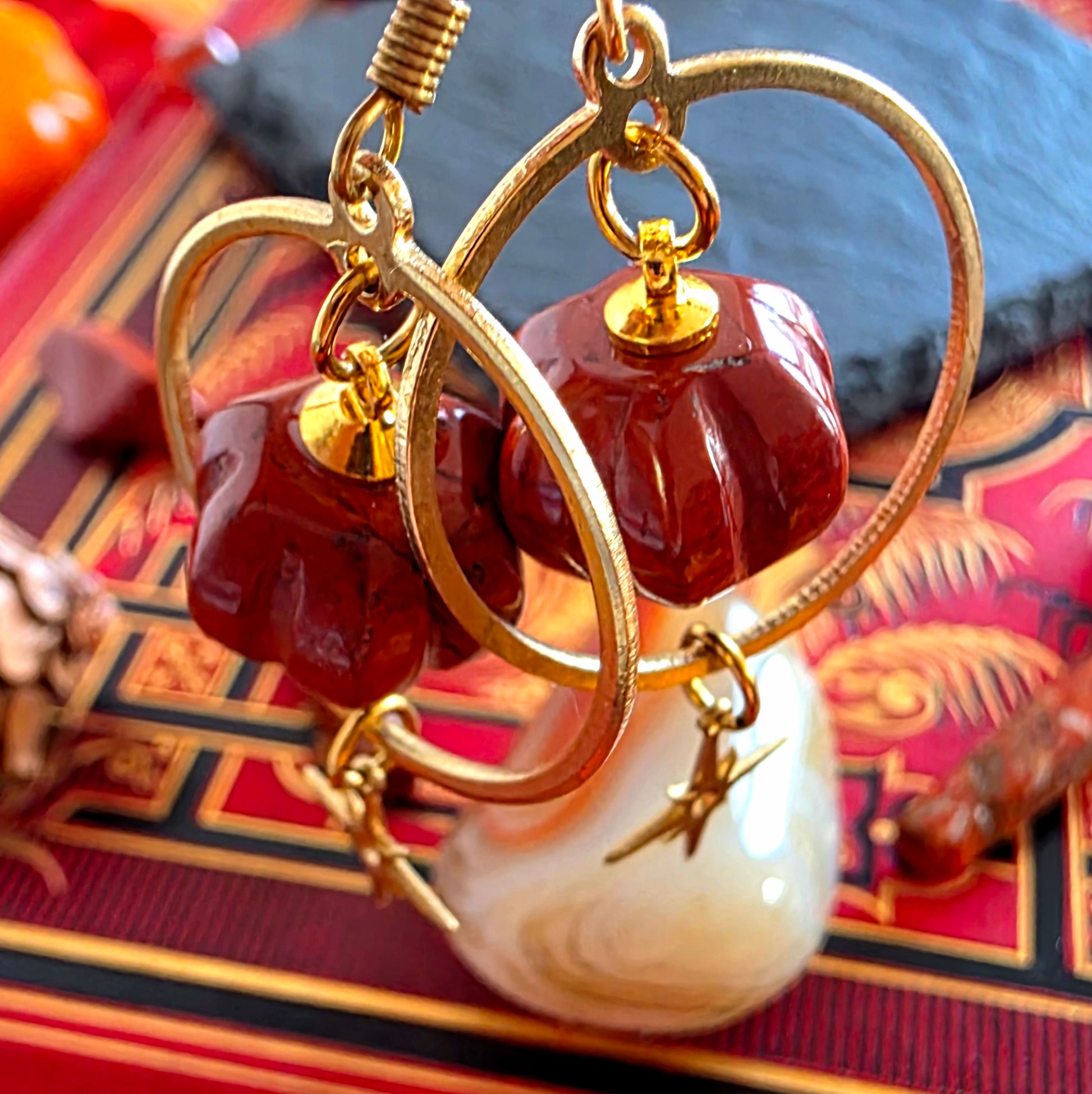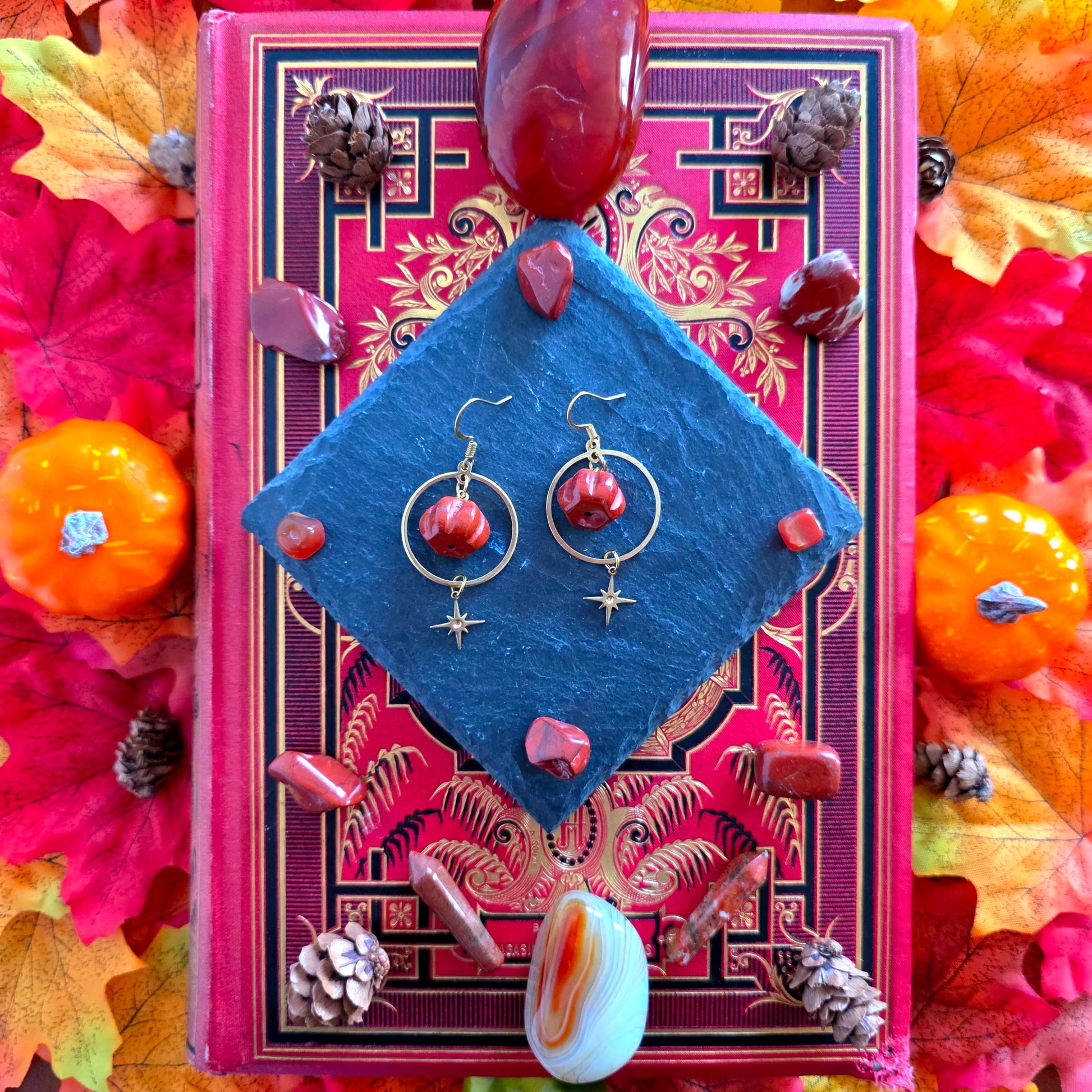 Une ravissante paire de boucles d'oreilles inspirées de l'automne réalisées à partir de breloques en forme de cercles et étoiles en laiton ainsi que de pierres de jaspe rouge taillées en forme de citrouille.