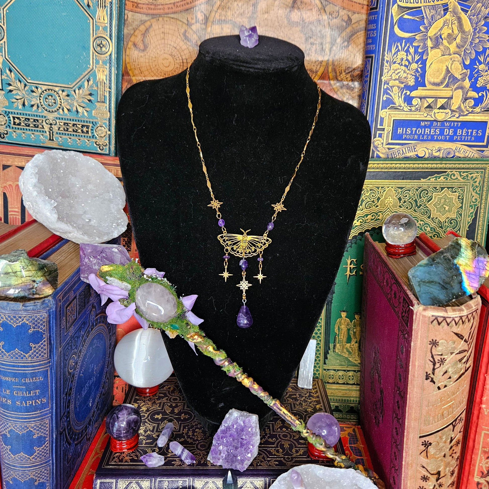 Titania - Collier Wicca / féérique acier inoxydable doré papillons étoiles, pierres d'améthyste - Les Rouages du Temps